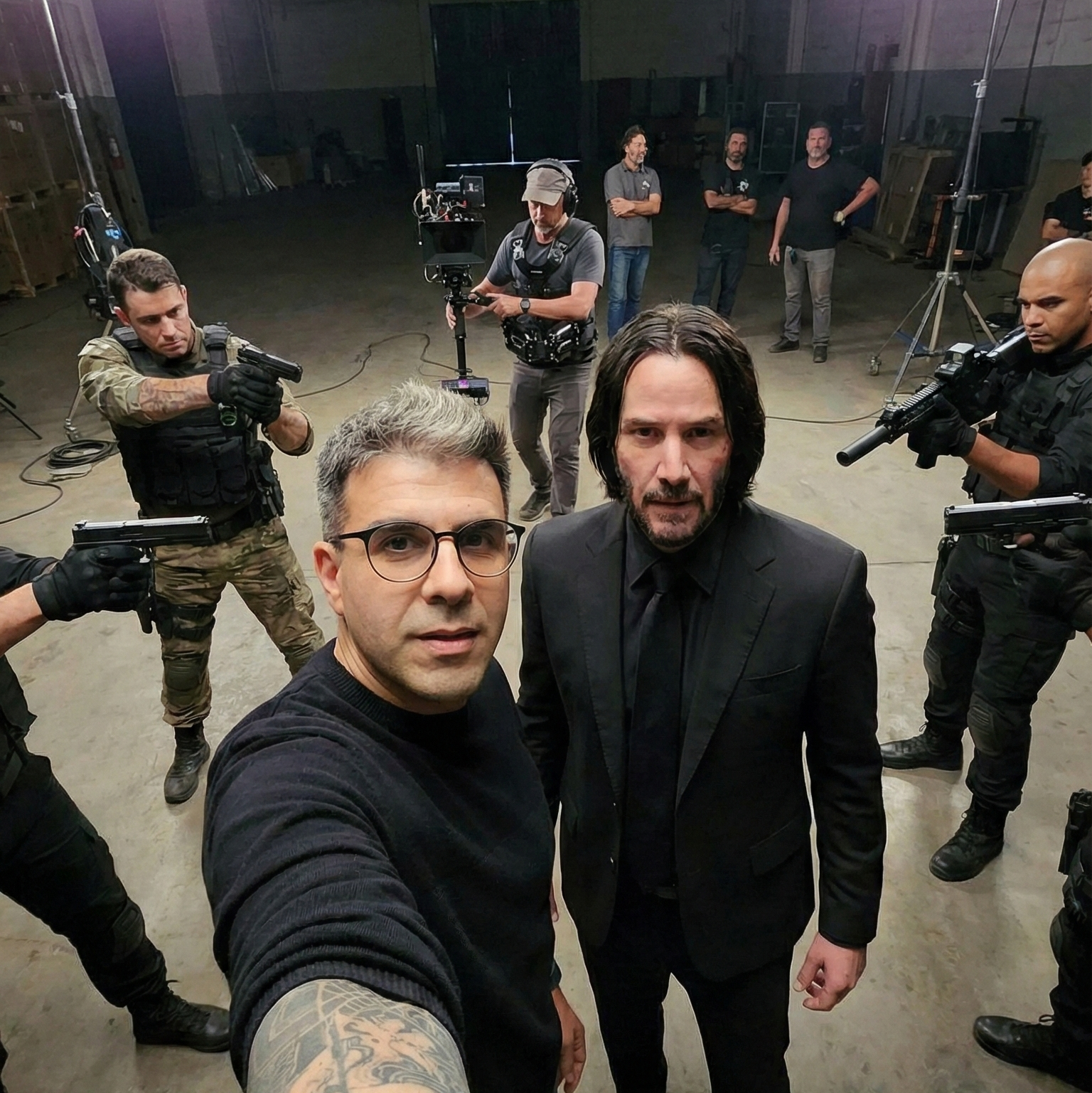 Create a highly realistic behind-the-scenes selfie on the original John Wick (2014) film set during a large standoff sequence, where the person from the uploaded Character Reference Image appears in the foreground taking a natural handheld selfie with an outstretched arm, with framing, perspective, and arm position matching a real front-facing selfie; no smartphone, camera, or recording device is visible, and the image itself is the final captured selfie. Standing directly next to the person is John Wick, clearly recognizable, life-sized, and naturally integrated into the scene, wearing his iconic black suit, white shirt, and black tie, slightly worn and realistic, consistent with the film, facing the camera and standing close to the person with a calm, focused, and composed expression, suggesting a quiet pause between takes rather than action, shooting, or heroic posing. Surrounding them at mid and background distance are multiple armed agents, all pointing firearms toward John Wick in controlled, professional stances, frozen in position as if waiting for a reset call, with no firing, no muzzle flashes, no motion blur, and neutral, professional expressions. The environment must exactly match the uploaded Environment Reference Image, depicting an interior urban location from John Wick such as a hotel corridor, warehouse, nightclub back area, or industrial interior, featuring concrete walls, modern architecture, subdued color palette, and polished floors or industrial textures consistent with the film’s locations. Film production elements are clearly visible throughout the scene, including cinema cameras on dollies, Steadicam or handheld rigs, lighting stands creating practical directional light, flags, diffusion frames, cables on the floor, boom microphones overhead, and crew members partially visible at the edges of the frame, making the set clearly feel like an active film production rather than a finished movie frame. Lighting is realistic, controlled, and grounded, consistent with the John Wick visual style, using practical sources, clean highlights, and natural shadows, with no stylized neon or exaggerated contrast. Depth of field must resemble a real selfie photograph, with sharp focus on the person and John Wick, while the surrounding agents are slightly softer but still clearly readable. The overall image should convey a tense yet quiet behind-the-scenes moment during the filming of a standoff scene, documentary-style and ultra-photorealistic, not an action shot, not promotional art, and not stylized violence, without altering the face, hairstyle, body, proportions, or appearance of the person from the Character Reference Image, and without beautifying, dramatizing, or stylizing John Wick or the scene, including no text, logos, or watermarks.