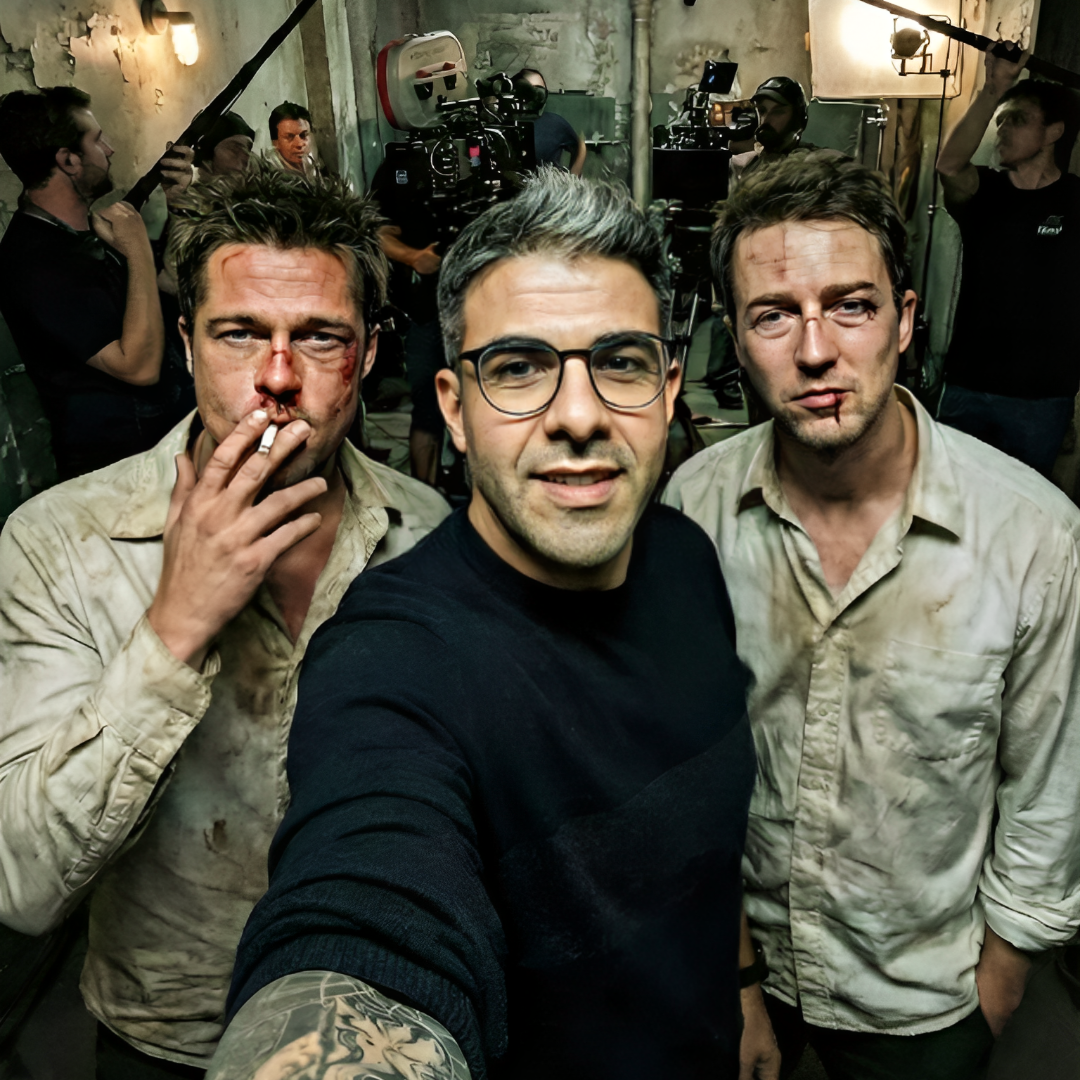 Create a highly realistic behind-the-scenes selfie on the original Fight Club (1999) film set during an underground basement fight scene, where the person from the uploaded Character Reference Image appears in the foreground holding a natural front-facing handheld selfie with an outstretched arm, with framing, arm perspective, slight distortion, and composition matching a real selfie; no phone, camera, or recording device is visible, and the image itself is the captured selfie. Standing extremely close to the person are the two main characters from Fight Club, clearly recognizable, life-sized, and grounded in realism, both showing visible physical damage such as blood on the nose, split lips, facial swelling, bruises around the eyes and cheekbones, and sweat mixed with grime, with injuries that look raw, recent, and unglamorous, not exaggerated or stylized. Their expressions are neutral to detached, with no smiles, no posing, no sense of dominance, appearing exhausted and slightly dissociated as if the fight has just paused, their posture relaxed but worn down, shoulders slightly slumped and breathing heavy, clearly not a victory moment. The environment must exactly match the uploaded Environment Reference Image, depicting a grimy underground basement fight club with concrete walls, exposed pipes, low ceilings, damp textures, flickering practical lights, and a sweat-stained floor, creating a claustrophobic, dirty, and realistic atmosphere. Subtle behind-the-scenes film production elements are visible but restrained, including cinema cameras on tripods or handheld rigs at the edges of the basement, basic lighting stands, cables taped to the floor, a boom microphone barely entering the top of the frame, and a few crew members standing in shadow near the walls, avoiding any clean studio look. Lighting is harsh, uneven, and practical, coming from single-source bulbs with harsh shadows and yellowish tones, without cinematic beauty lighting, emphasizing painfully real skin texture, sweat, cuts, and swelling. Depth of field must match a real selfie photograph, with sharp focus on the person in the foreground, the two fighters clearly readable, and the background slightly softer but detailed, creating an image that feels accidental, uncomfortable, and intimate, like a moment never meant to be documented, in an ultra-photorealistic, documentary-style realism, without altering the face, hairstyle, body, proportions, or appearance of the person from the Character Reference Image, without glamorizing violence or stylizing blood or injuries, and with no text, logos, or watermarks.