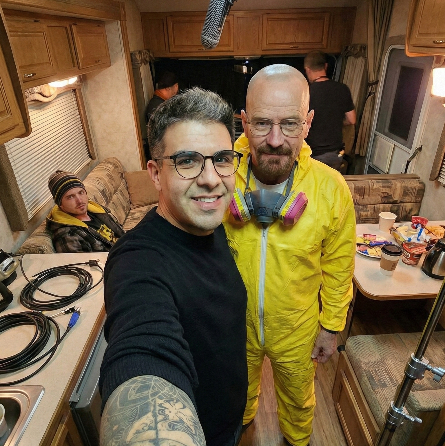 Create a highly realistic behind-the-scenes selfie on the Breaking Bad set. The person from the uploaded character reference photo is in the foreground, taking a selfie with an outstretched arm, exactly like a real selfie. The perspective, framing, and arm position must match a natural handheld selfie. No smartphone, no camera, and no device is visible in the image. The photo itself is the final captured selfie. The person is posing directly next to Walter White, who is facing the camera and clearly interacting with the person. Walter White is wearing his iconic yellow hazmat suit with the respirator hanging around his neck. In the background, Jesse Pinkman is sitting on the couch inside the RV, clearly visible and recognizable, relaxed and slightly slouched. The environment must exactly match the uploaded environment reference image: the interior of the Breaking Bad RV with film lights, boom microphone visible above, camera equipment, crew members partially visible, cables on the floor, snacks on the table, and a realistic on-set production atmosphere. The lighting is natural and cinematic, like a candid behind-the-scenes moment between takes. The image must look like a real behind-the-scenes selfie, not staged, not promotional, highly photorealistic. Do not alter the face, hairstyle, or body of the person from the character reference photo