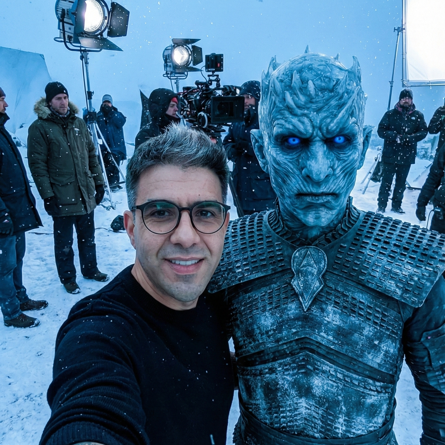 Create a highly realistic behind-the-scenes selfie on the Game of Thrones set. The person from the uploaded character reference photo is in the foreground, taking a selfie with an outstretched arm, natural selfie perspective, no visible phone or camera. The photo itself is the finished selfie. The person is posing directly next to a White Walker THE NIGHT KING, who is facing the camera and standing very close. The White Walker has icy blue skin, glowing blue eyes, and detailed frozen armor. In the background, the environment must exactly match the referenced set: snowy battlefield, cold blue lighting, snow particles in the air, film lights, camera rig, crew members visible, and boom microphone overhead. The ground is icy and snow-covered. The atmosphere is cold, cinematic, and dramatic, but clearly behind-the-scenes. Photorealistic, candid, unstaged. Do not alter the face, hairstyle, or body of the person from the character reference photo.