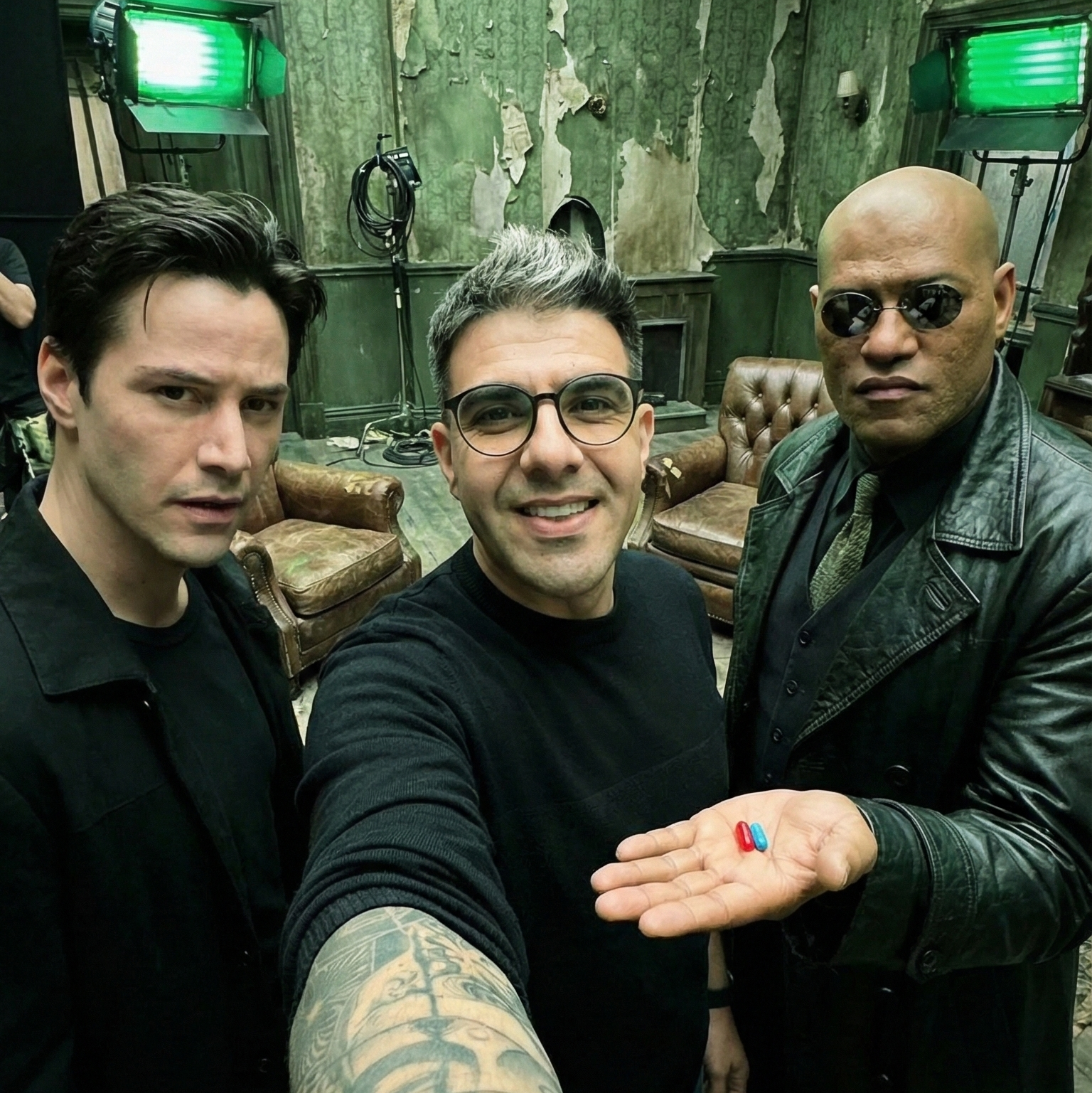 Crie uma selfie de bastidores altamente realista no set de filmagem de “Matrix”. A pessoa da foto de referência do personagem carregada está em primeiro plano, tirando uma selfie com o braço esticado, em uma perspectiva natural de selfie. A foto em si é o resultado final.
